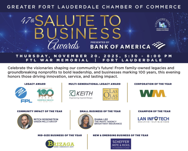 Join us for the prestigious 47th Salute to Business Awards Reception presented by Bank of America on November 20, 2025. Hosted at the FTL War Memorial in Fort Lauderdale, Florida.